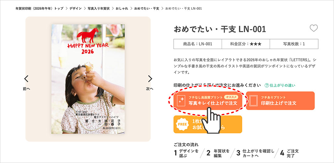 選んだデザインの商品ページが開きます。「写真キレイ仕上げ(フチなし高画質プリント)」または「印刷仕上げ(フチありプリント)」のボタンを選んで注文ページに進みます。 価格や納期を知りたいときは、商品ページを下に進んでいただくと説明が現れますので、そちらよりご確認ください。
