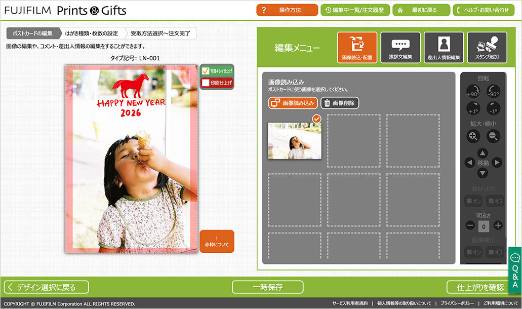 お気に入りの写真をアップし、デザインテンプレートに合成して年賀状を作成します。