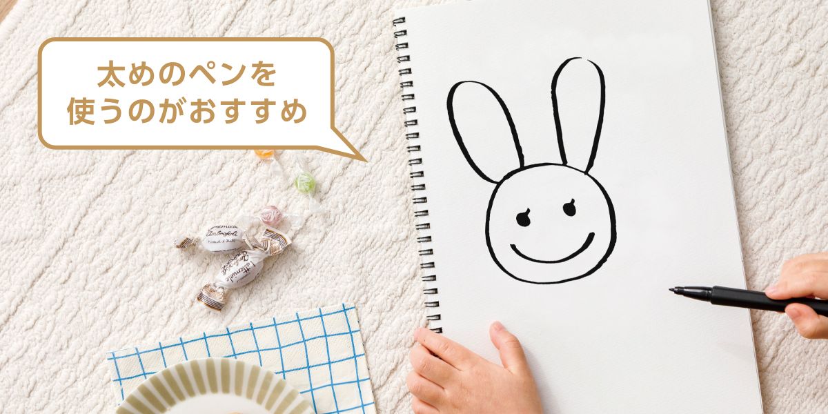 白い紙(無地)と黒いペン(中太)を準備し、文字やイラストを描きます。