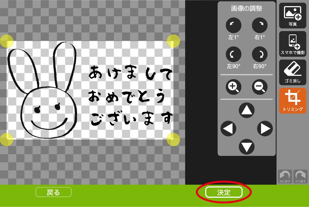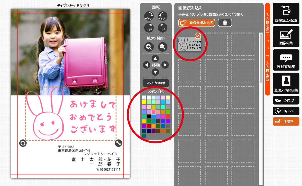 追加した手書き文字やイラストはスタンプになり、年賀状の好きなところに配置することができます。