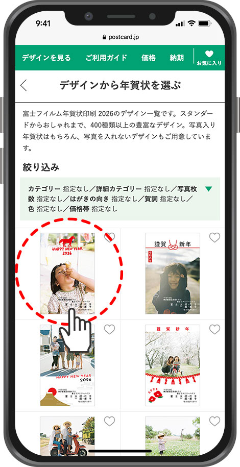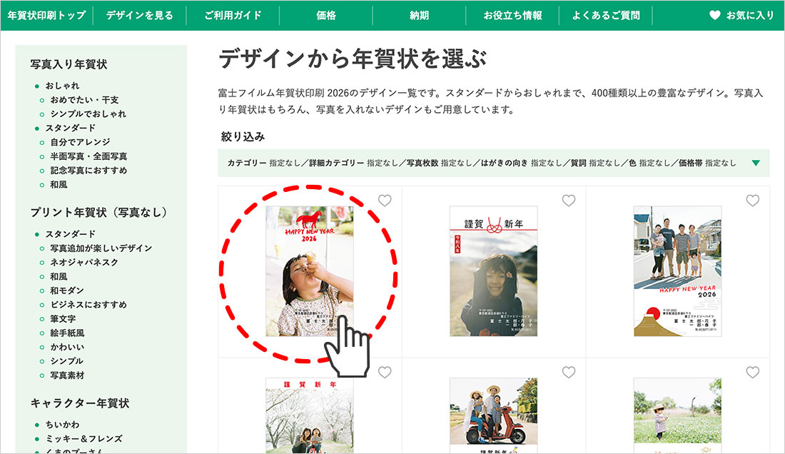 サイトの中から、お好みのデザインの年賀状をクリックします。