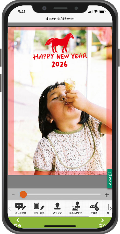 お気に入りの写真をアップし、デザインテンプレートに合成して年賀状を作成します。