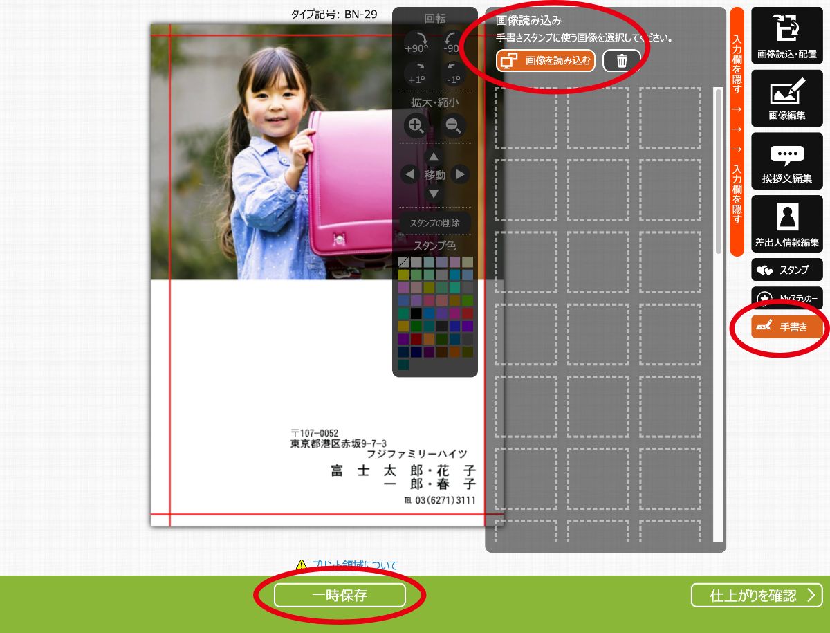 編集画面右下の「手書き」ボタンを押し、「画像を読み込む」ボタンを押します。