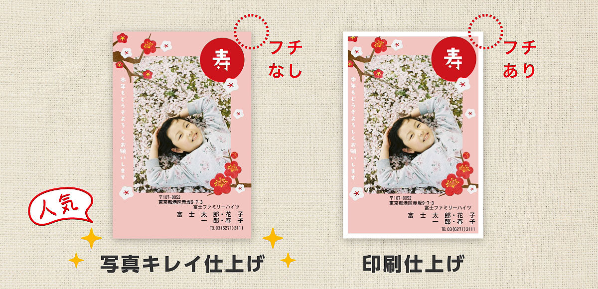 フジカラーの年賀状は、仕上げの種類、デザインや枚数によって価格が異なります。
